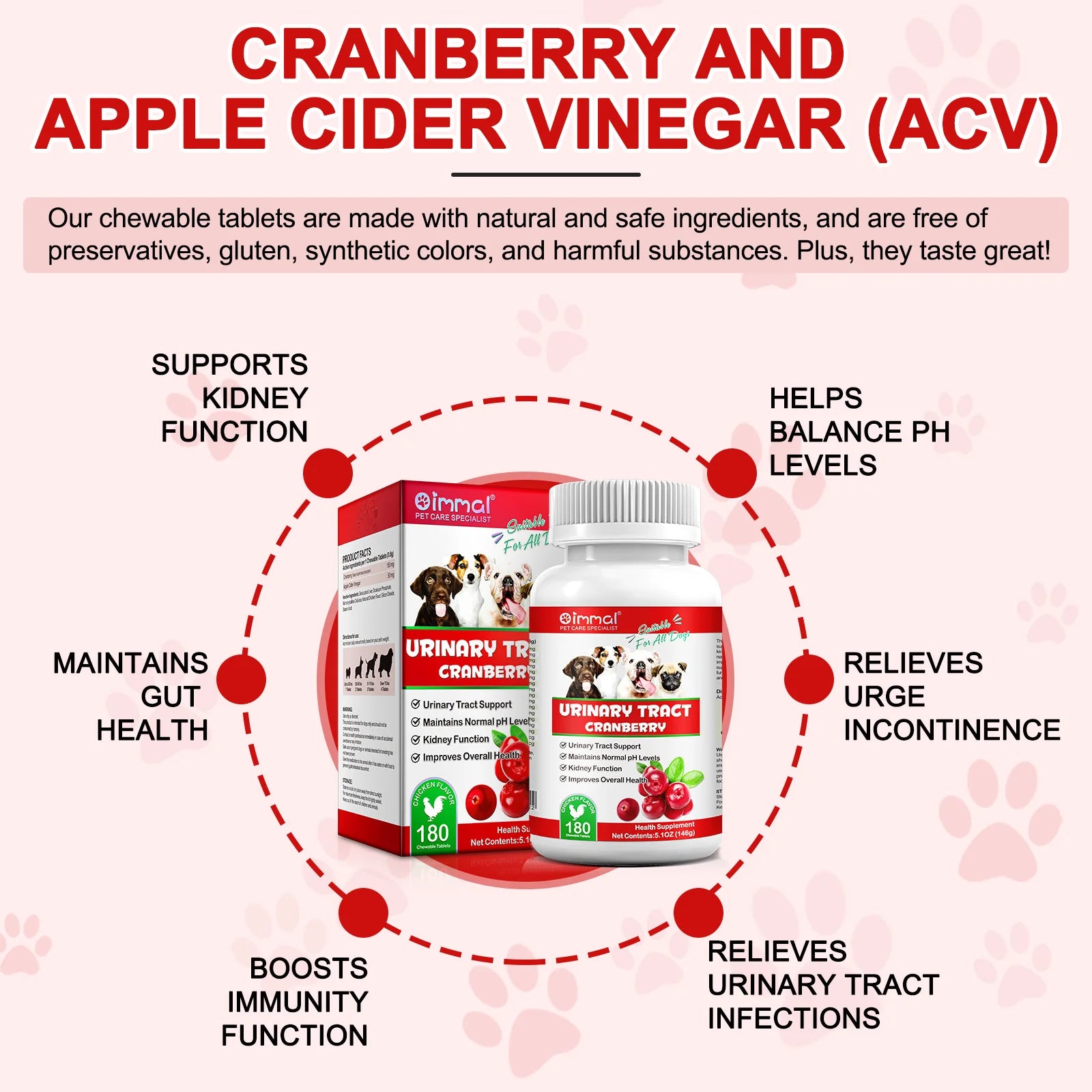 Oimmal Urinary Tract Support is a natural supplement that includes cranberries and has been used for centuries to maintain urethral health in pets. Our unique formula blends high-quality cranberry with apple cider vinegar (ACV), which is rich in essential vitamins, minerals, and antioxidants like vitamin C and vitamin E. This combination helps to balance pH levels, alleviate urinary tract infections, relieve incontinence, boost kidney function and intestinal health, and improve pet immunity.
