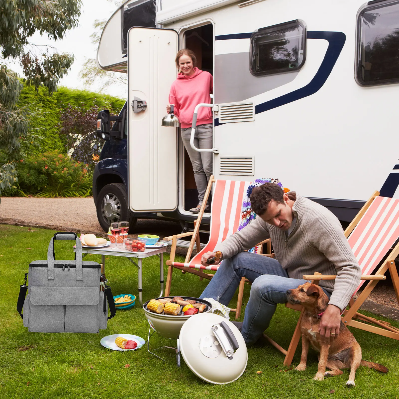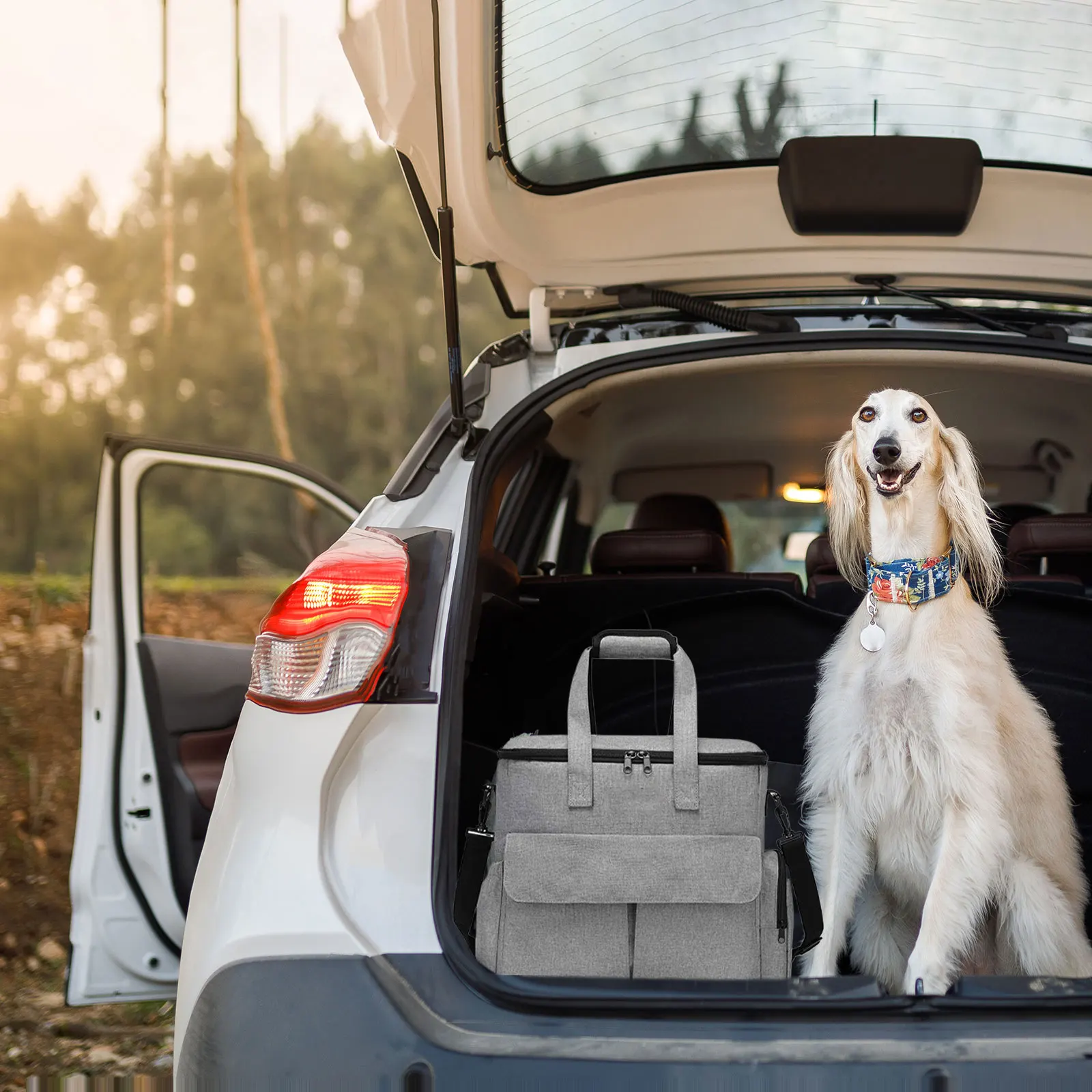 The Dog Travel Organizer Kit Bag Ideal for everyday use for all of your essentials: conveniently carries food, water, treats, leashes, Frisbee, pet toys, first-aid kit. Applicable Occasions: traveling, hiking, outdoor activities, go to the park.