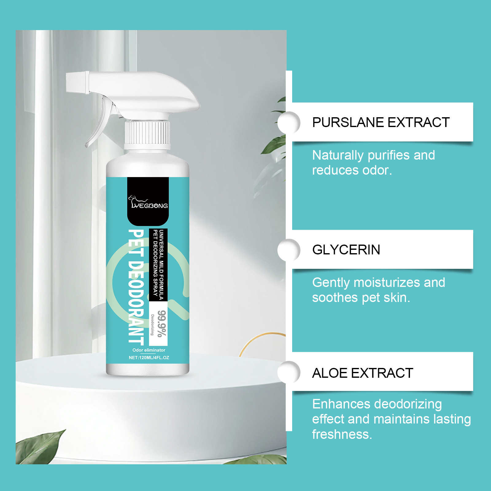 Our pet deodorant spray contains glycerin and propylene glycol. It instantly removes odors and creates a comfortable space. Its application is simple: simply spray it directly on pets, pet bedding, carpets, and other surfaces that need deodorization. And use mild ingredients to protect pet health.
